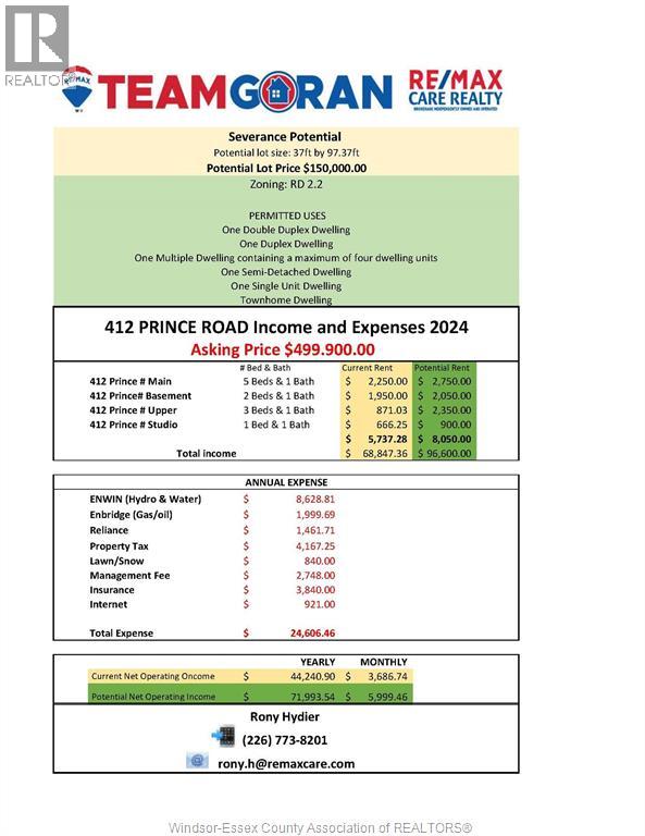 This income-generating property features four self-contained units: a spacious 5-bedroom main floor, 3-bedroom second floor, 2-bedroom basement unit, and a 1-bedroom attic suite — each equipped with a full kitchen and bathroom. with a total potential rent of up to $8,050/month ($96,600/year) and a projected noi over $71,000, additional highlights include 200 amp service with sub-panels, rear parking for 4 vehicles, and separate entrances for each unit.The property supports future development options including townhomes, duplexes, or a 4-unit multiplex. located near the university of windsor, historic sandwich town, and just minutes to the new gordie howe international bridge, this high-demand area offers long-term value and rental stability. The seller reserves the right to accept, decline, or counter any offer at their sole discretion. schedule b found in documents. buyer to verify all information, including zoning, severance potential, and development options directly with the municipality. (id:4555)