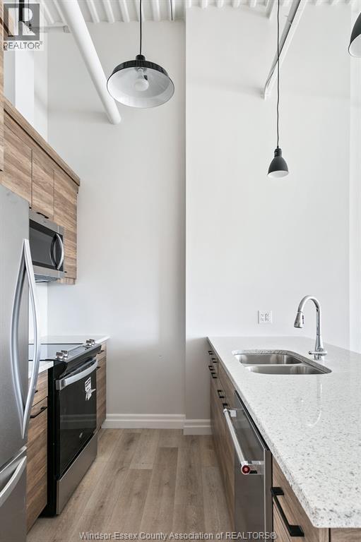 Interesting loft unit in the heart of LaSalle. Walk to shops, medical offices, restaurants, banks, etc. Soaring open ceilings, vinyl plank floors, open plan kitchen/dining/living room. Large island with Quartz countertop. All appliances included. Assigned surface parking included. No rental charges for furnace, etc. Credit check and proof of employment required. 1 year lease. Tenant pays utilities (gas, water and hydro). PLEASE NOTE: small pets only (20 lbs max). By appointment only. (id:4555)